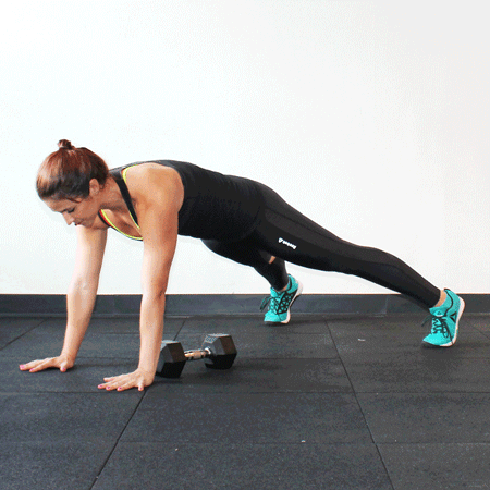Jump your feet back up, and grab the dumbbell with your left hand. Swing it over your head and back down. Do another push-up. This is one rep.