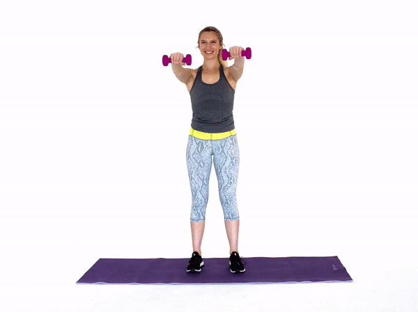 Bracing core and keeping arms straight, lift weights straight up to shoulder height.